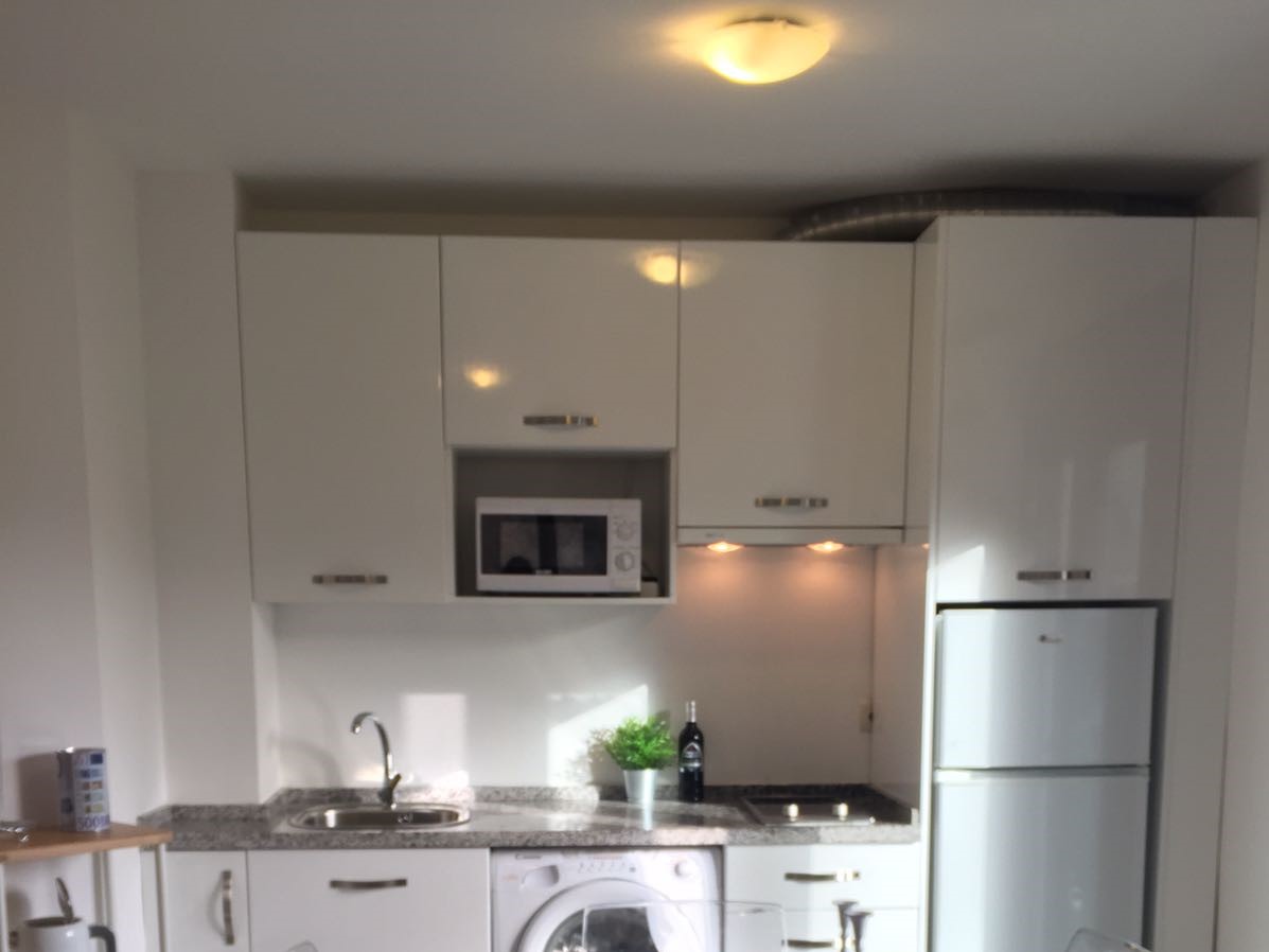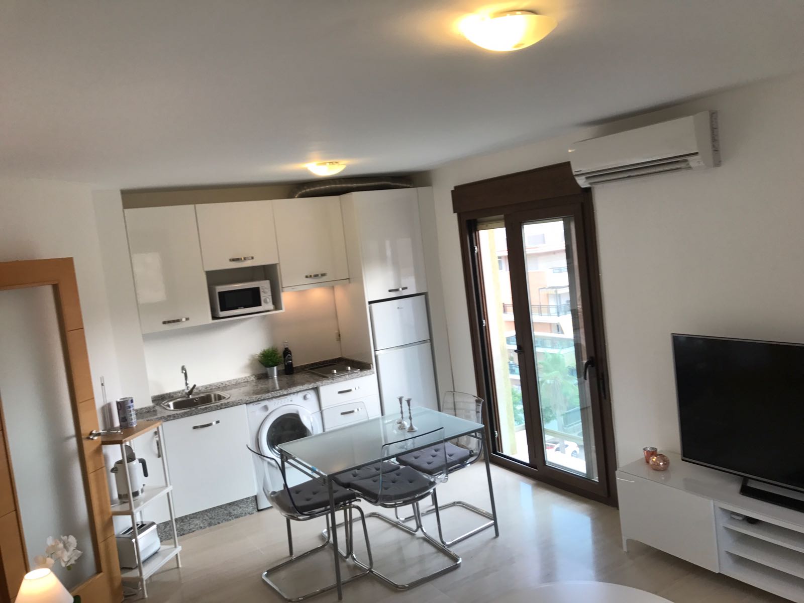 Salotto con sala da pranzo e cucina a vista, due camere da letto e un bagno. Posto auto incluso.